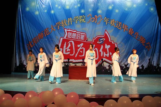 毕业典礼之后,在校师生也为2012届毕业生送上祝福,奉献了一场精彩纷呈的“因为有你”毕业生欢送会。欢送会分为“那一年,我们怀揣梦想”“那一年,我们激情飞扬”“那一年,我们拼搏忙碌”“那一年,我们扬帆起航”等四个篇章。一个个小品表演着在校期间的欢愉,一曲曲歌述说着离愁别绪,一支支舞演绎着离别感伤,不禁使许多同学潸然泪下。