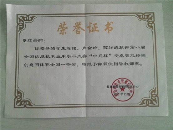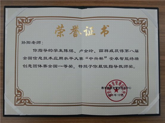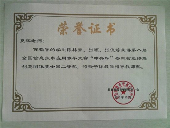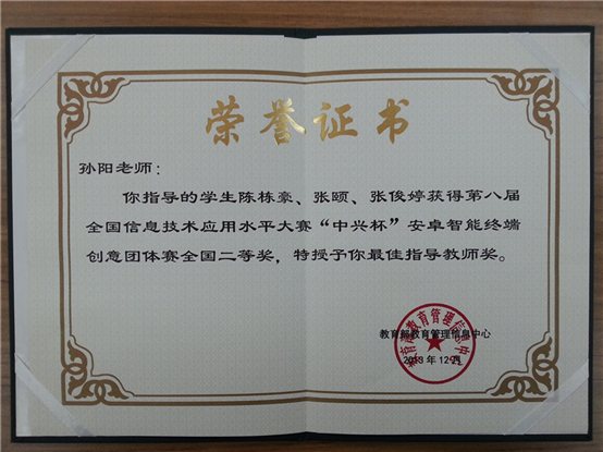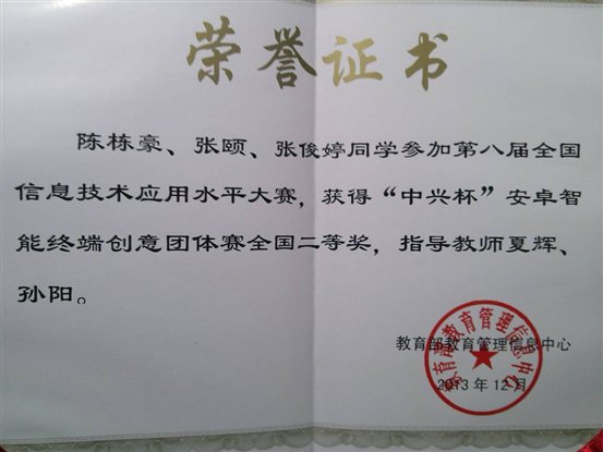 12月9日结束的第八届全国信息技术应用水平大赛“中兴杯”安卓智能终端创意大赛全国总决赛中,我公司由2010级网络工程和软件工程专业6名员工组成的两个365官网体育代表队经过激烈角逐,最终荣获安卓智能终端创意大赛团体赛一个全国一等奖和一个全国二等奖。公司孙阳、夏辉老师被授予“最佳指导教师”称号。