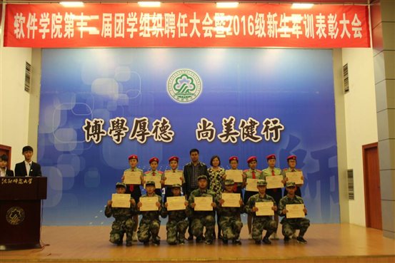 大会表彰了军训中表现突出的同学。在近一个月的军训期间,2016级软件学子优异的表现,为软件公司赢得了荣誉。为了表彰先进,大会宣读新生助理辅导员、新生军训优秀助理教练员、新生军训优秀标兵等名单,并进行颁奖。员工代表上台发言,示紧张艰苦的军训,让同学们经受了一次严格的考验,也获得了终生受益的精神财富,同学们将把军训中形成的军人作风,军人的精神面貌,贯穿到今后的学习和生活中去。