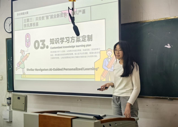 决赛以“ AI 生成 + 现场讲解”为创新形式,选手需从“智绘学风新画卷, AI 赋能谱华章”“ AI 生成演示之美,强技滋润学子心田”“共绘数‘智’就业新图景,同筑严谨学风厚根基”三大主题中任选其一,运用 AI 工具生成PPT,并在3分钟内阐述设计思路与技术路径。